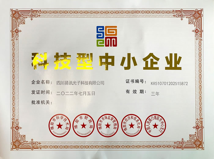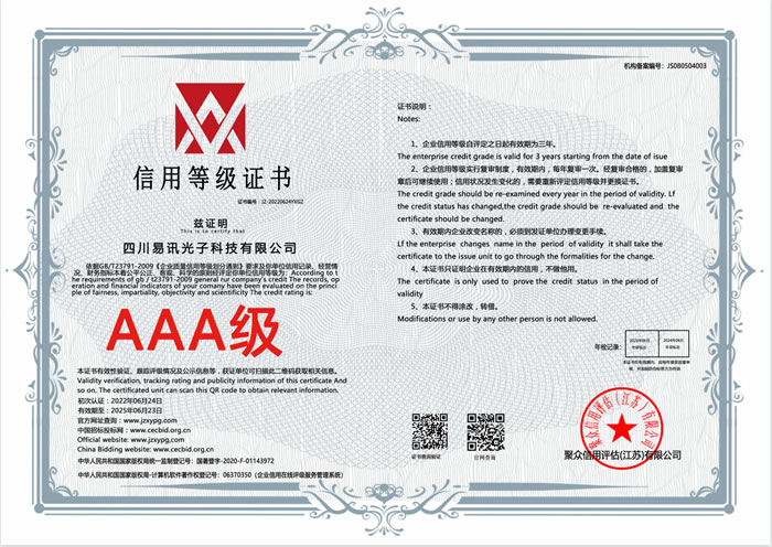 2022年8月22日,四川易讯光子继获得3A级信用企业、立信企业、科技型企业外,又获得ISO9001质量管理体系认证。